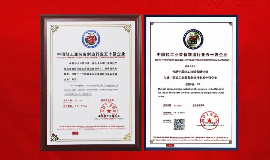 Zhongchen Light Machinery was honored as one of the top 50 enterprises in China's light industrial equipment manufacturing industry.